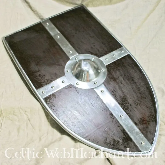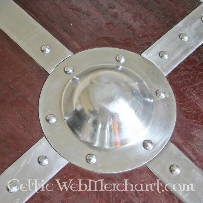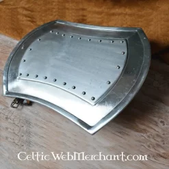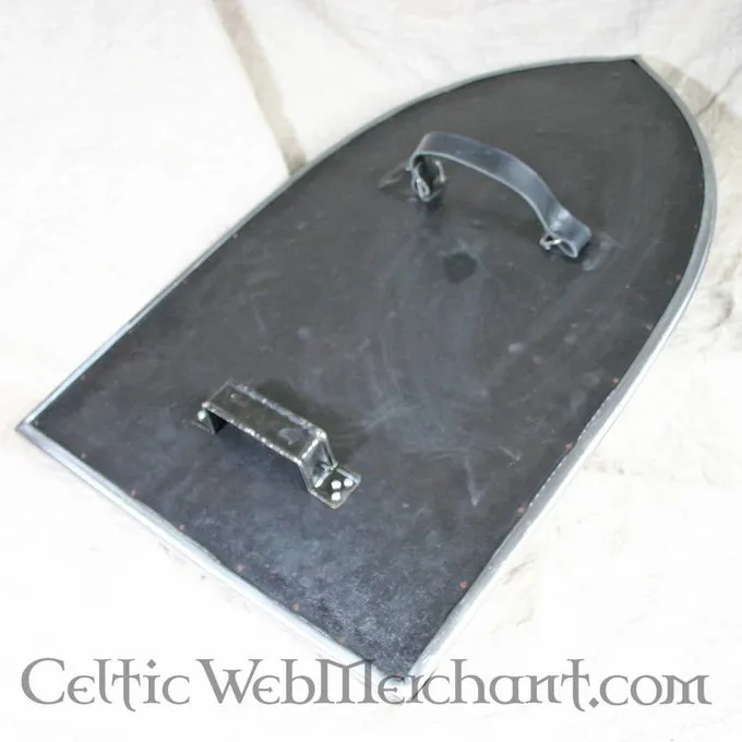 Ce bouclier est battu avec de l’acier pour la sécurité. Il a une hauteur de 64 cm, sa largeur est de 49 cm et il a un poids de 2,2 kg.