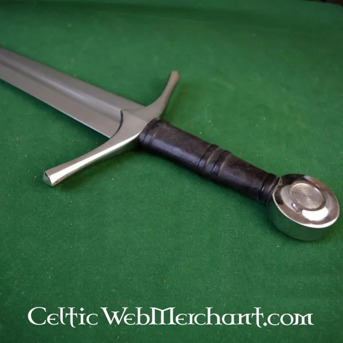 Cette épée solitaire a une longueur d’env. 90 cm et une lame de 72 cm et un maximum. largeur de 5 cm. Le pommeau décoré simple et la croix-garde étaient typiques de leur époque. La croix-garde est légèrement plié à parer ennemies. La poignée en bois est recouverte de cuir pour une bonne prise en main.