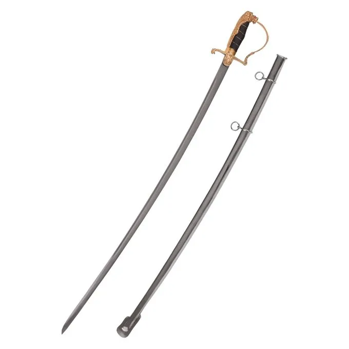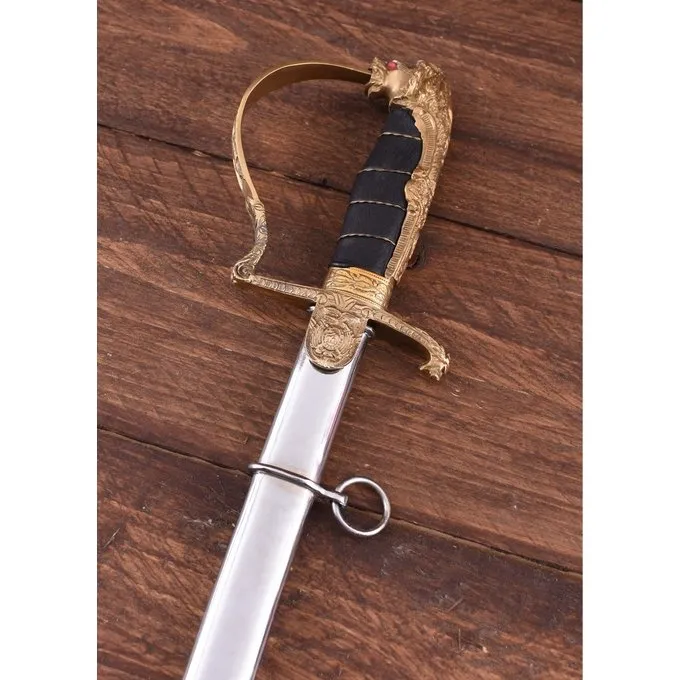 Ce sabre a un pommeau vissé. Les quillions, l’archet et le pommeau sont en laiton doré. Le pommeau a la forme d’une tête de lion et le lion a des yeux de verre rouge incrustés. Les quillions représentent également une tête de lion et diverses décorations organiques sous forme de feuilles, de vrilles et d’un oiseau. La poignée est en bois et entourée de cuir noir et de fil de laiton. Le sabre est livré avec un fourreau en acier et des boucles de ceinture.