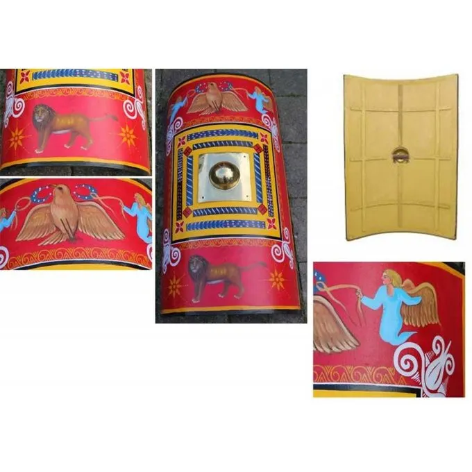 Ce scutum est une réplique d’un bouclier romain tardif du 3ème siècle de notre ère. L’original a été trouvé dans Dura Europos (Syrie).