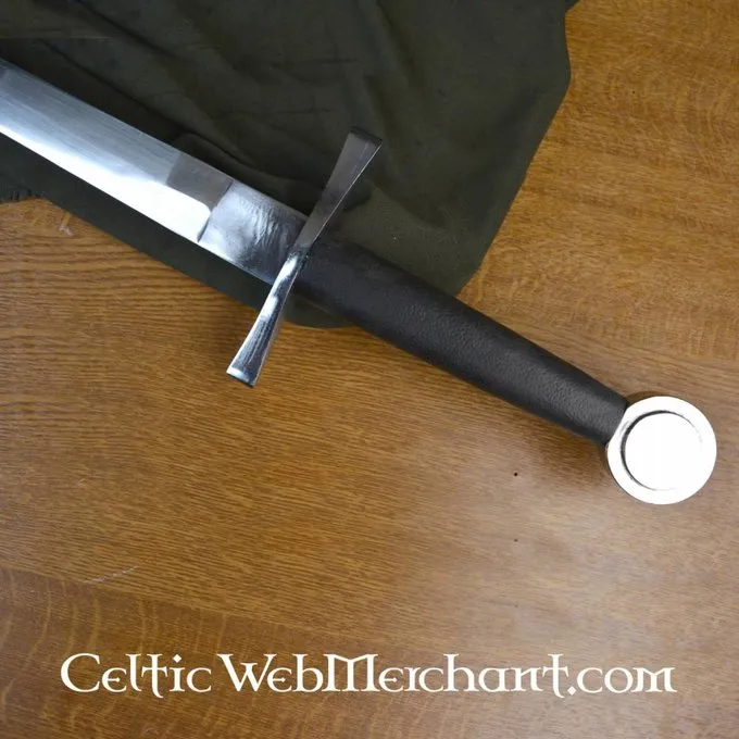 L’acier doux de l’épée est faite d’un morceau de métal pour la sécurité, la solidité et le confort. La poignée en bois est recouvert de cuir. La longueur de la lame d’une seule main est 97,5 cm avec une largeur de lame maximale d’env. 3,7 cm. La longueur de la lame est de 77 cm.