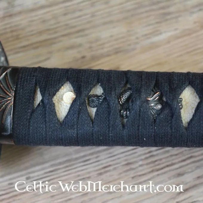 Ce katana a une longue queue (nakago) qui est obsédé dans la poignée par deux axes de bambou (de mekugi). Il a également une haute sabre noir poli laqué (saya) dans le style Kuroro en bois. Le katana est livrée avec une housse de tissu de protection et une boîte de Collector frappante.