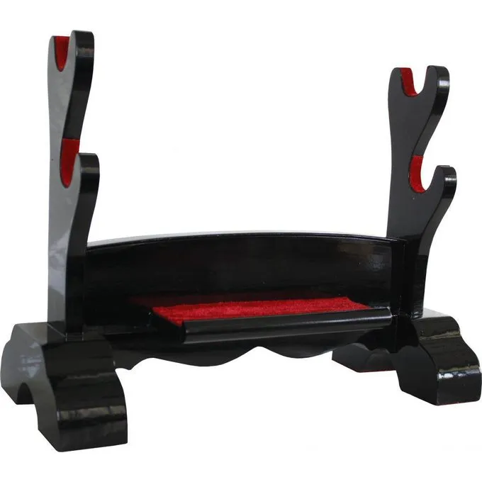 Cette norme de katana de luxe permet de trois épées de samouraï, Tantos ou wakizashis. Le stand est faite de bois teinté noir et incrusté de tissu doux rouge. Cette norme de luxe est de 41 cm de large et 31 cm de long.