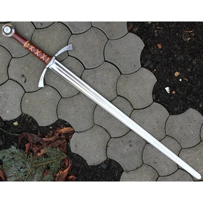 Cette épée à la main et demie est basée sur plusieurs originaux historiques. Sa longueur est de 118,5 cm avec une lame de 89,5 cm et il pèse 2150 g. La poignée donne à l’épée un caractère unique. L’épée est en acier au carbone avec une dureté Rockwell de HRC 54 ? 56.