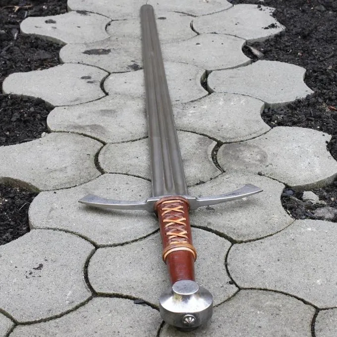 Détails du produit : Longueur : 118,5 cm / Longueur de la lame : 89,5 cm / Longueur du manche : 29 cm / Poids : 2150 g / Type d’acier : Acier à ressort (DIN 54SiCr6) 54-56 HRC / Tranchant : Blunt (3 mm battle-ready) / Construction de la soie : constructio