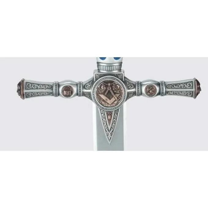 Cette épée à deux mains montre les symboles typiques de la franc-maçonnerie: l’équerre et le compas, le marteau maçons, le soleil et la lune et le Livre de la science.