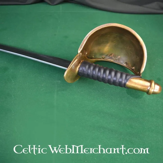 Détails de produit: Longueur: 77 cm / Longueur de lame: 61 cm / Type d’acier de la lame: EN45 acier au caros, dureté 48 HRC / Tranchant afilé: semi-tranchant / Soie: soie complète / Pommeau: vissé / Recouvrement de la poignée: laiton, bois, cuir / Basé su
