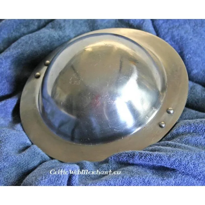Ce bouclier est fait d’acier d’épaisseur 2 mm. Il a un diamètre de 16,5 cm et pèse 0,55 kg. La poignée est enroulée autour de cuir.