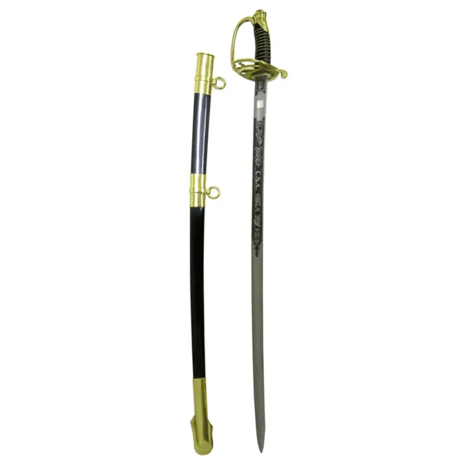 Une belle épée réplique par Windlass Steelcrafts, sur la base d’un sabre de cavalerie utilisé pendant la guerre de Sécession. Les soldats se sont battus avec ces sabres durant des combats comme Antietam, Manassas et Gettysburg. La guerre de Sécession a eu lieu entre 1861 et 1865 et a été menée entre les États du Sud (Confédération) et les États du Nord. Ce sabre est basé sur Sabres historiques utilisés par l’armée confédérée, à savoir les États du Sud. Ce sabre est basé sur le sabre du général Jo Shelby du Missouri, qui n’a jamais cédé à ses ennemis. La prise en main est en cuir noir avec fil d’acier et la poignée est décorée de feuilles de laurier: le symbole de la victoire militaire. La lame est gravée avec C.S.A, qui fait référence à l’armée confédérée. Il est livré notamment un fourreau en acier bleui avec des boucles de ceinture. La lame flexible semi-forte est forgée à partir d’acier au carbone 1095 trempé d’une dureté de 48-52 HRC. Une grande épée ornementale pour le mur, aussi belle pour reenactment American Civil War ou pour cosplay de séries comme Deadwood ou Hell on Wheels. Lorsque vous blunten la lame, il est une grande bataille prêt sabre pour le combat à l’épée.