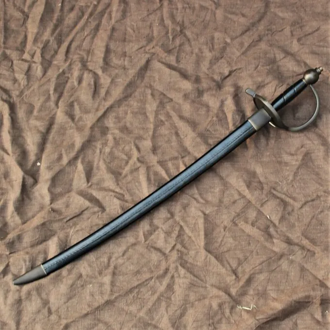 Cette épée réplique est basée sur des épées historiques de l’époque des pirates des Caraïbes. épées de pirates comme celui-ci sont utilisés dans la série des pirates et des films comme Pirates des Caraïbes Voiles et noir. Les histoires sont bien connus: célèbres pirates des Caraïbes comme Francis Drake, Anne Bonny, Charles Vane et Edward Teach ont attaqué des navires des Anglais et des gouvernements espagnols tentent de fournir leurs colonies dans les Amériques. Le sabre était avant tout l’épée de pirate. De nombreux pirates avaient un fond bleu marine et tout simplement apporté leur arme, ou ils les ont volé des navires. La lame semi-forte est forgée à partir trempé 1065 acier au carbone ayant une dureté de 48-52 HRC. La poignée est enveloppé de cuir noir et la poignée est en laiton avec une couche en laiton patiné de sorte qu’il ressemble à un vrai vieille épée. Il est livré avec notamment un fourreau de la même finition antique. Cette épée est un atout pour votre collection et merveilleux pour un costume de pirate ou cosplay. Lorsque vous blunten la lame, il est aussi parfait comme une bataille épée prête et apte pour le combat à l’épée.